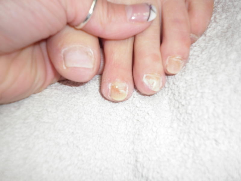 En faite sur deux de ses ongles ça a jauni,puis du coup sur un des deux quand j'ai limé pour voir le souci de plus près, son ongle s'éffritais..