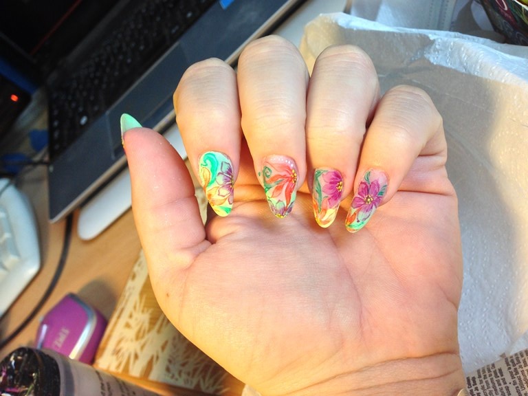 Deja, j'ai decidée de laisser pousser mes ongles pour en avoir lorsque bb arrivera puisque pas le droit aux faux. Donc pas de rallongement, la derniere fois j'ai essayer pour la premiere fois l'aquarelle .. trop moche voir ci joint lol