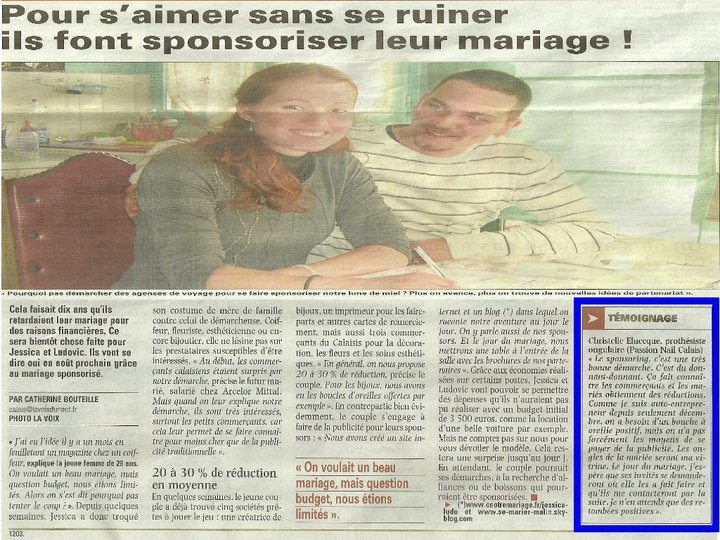 kikou les foforettes il y a peu une futur mariee m'a contacte pour que je sois sa prothesiste ongulaire pour le jour j et que je sponsorise son mariage!donc le but je lui fait une redution pour l essaie et la pose et le jour j je lui offre la deco et en contre partie elle me fait de la pub !samedi la voix du nord m'a contacte afin que je donne mes impressions sur cette echange ,et ce matin en ouvrant le journal et bien mon temoignage a ete publié yesss!!!