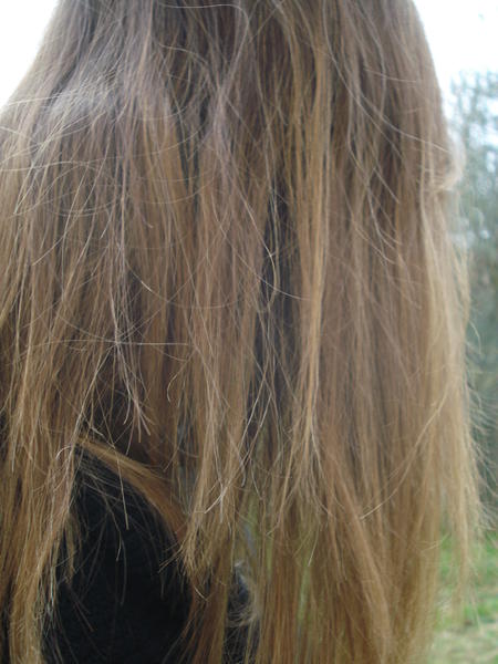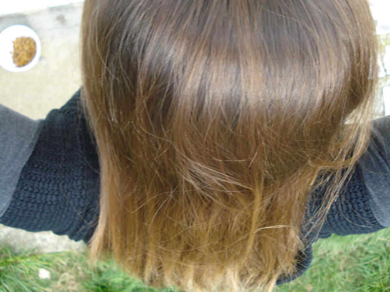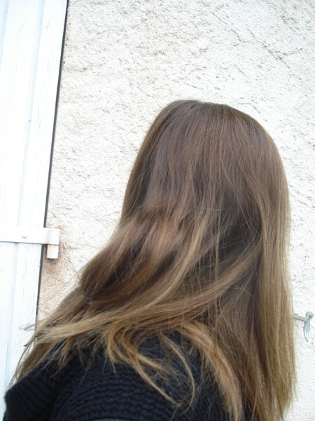 Alors j'ai un reste de mèche blonde, après j'ai fait une couleur chocolat puis une couleur à la maison avec une crème l'ore*l c'était du miel un truc comme ça je crois...