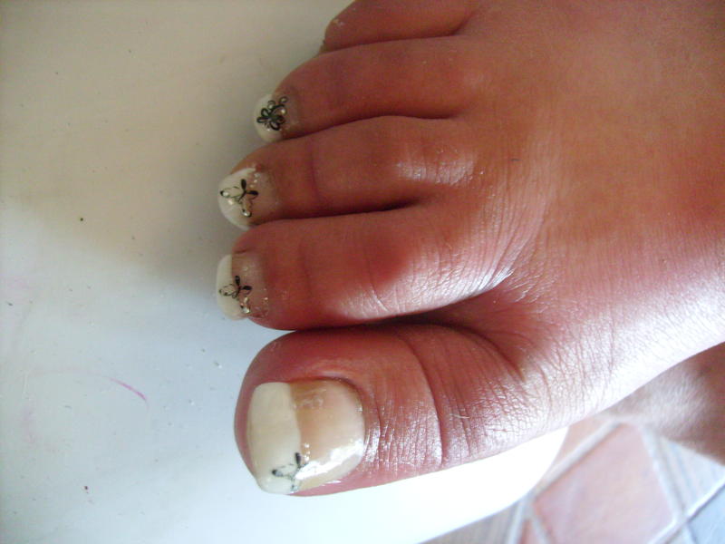 attention à la french elle n'est pas régulière sur tous les ongles pour les pieds heu franchement c'est pas joli joli, j'aurais limé beaucoup plus les ongles et on voit que ta french fait un bourrelet et là alors elle n'est absolument pas régulière attention à ca.... entrainement entrainement bonne continuation