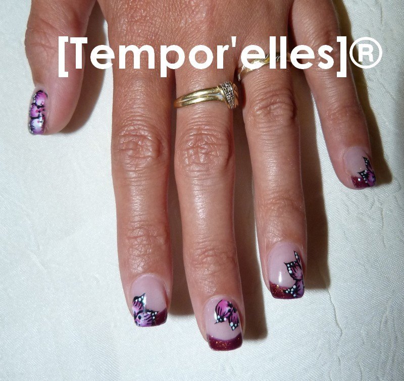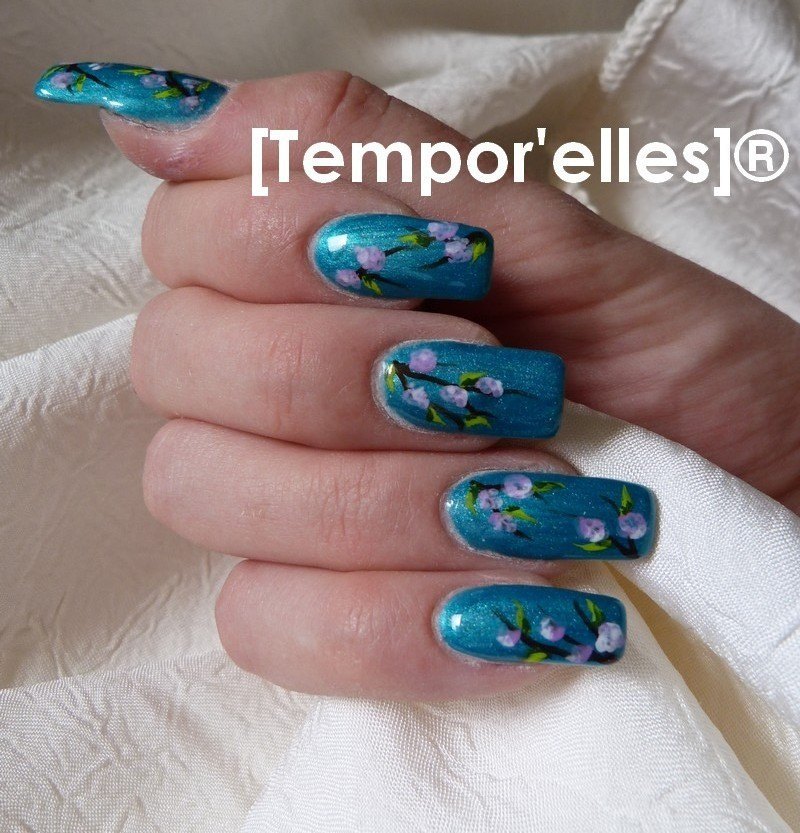 3e photo et 4e photo - Pose vernis permanent Gelish sur ongles naturel (dont une extension) sur moi même et ma mauvaise main. Déco inspirée des "ongles au jardin" de pronails.