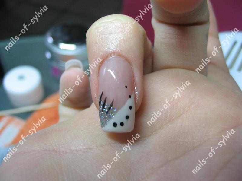 test sur mon annulaire de la main droite: rallongement au chablon: idem que la 2eme pose avec gel pailletté argent, french ultrawhite et flex noir en déco.