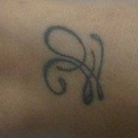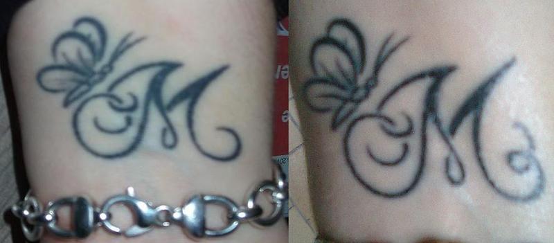 Finalement j'ai juste rajouter une petite boucle, je vous met le avant-après, l'idée du papillion était bonne mais il était si petit (le 'grand' ne fais deja qu'1,5cm a tout casser) que mon tatoueur m'a dit qu'avec le temps il ne resterais qu' une petite 'tache' noir :sad2: , idem pour les prolongations du trait du M vers le papillion...