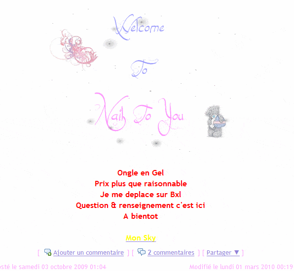 maintenant c'est vrai que parfois y'en a qui font des supers boulettes et quand des clientes me disent "ça me faisait tjs mal chez l'autre" ou bien "faites attention svp car une fois on m'a tué les ongles avec le gel" ben ça me fout en boule!!!! là oui je pourrais lui passer un savon à l'autre qui a fait du boulot de merde! ça donne une sale réputation "aux faux ongles".