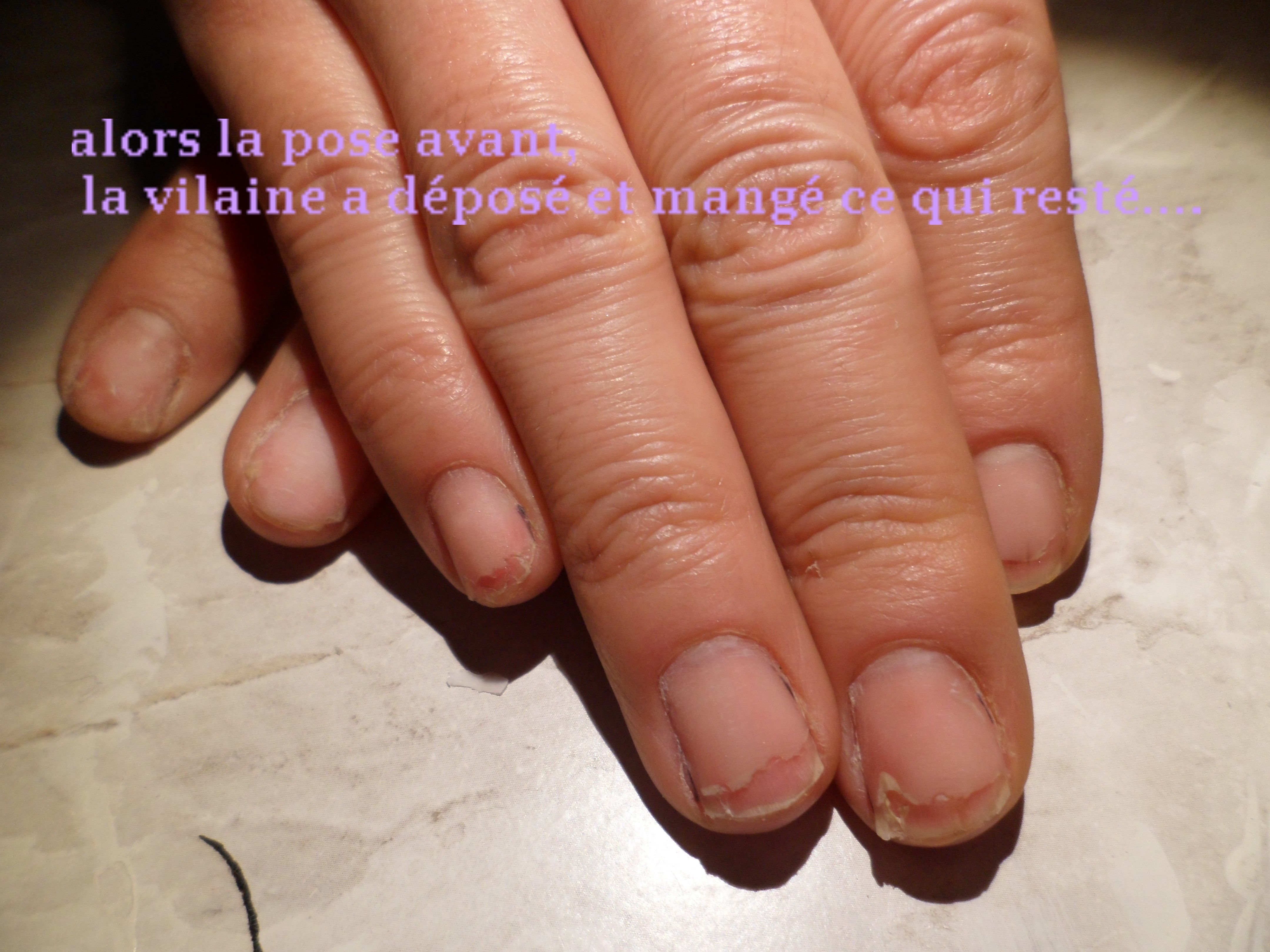 Mon dieu que j en ai bavé sur cette pose!!!! Ma copine avait déposé toute seule, bon plutôt sympa, sauf qu'elle ne s'est pas arrêtée là!!!! elle a tout grignoté!! c'est une rongeuse compulsive lol! Donc fallait vite faire quelque chose avant qu'elle n en arrive au sang!!! Elle voulais du très long..jusque là tout va bien, elle est habituée...