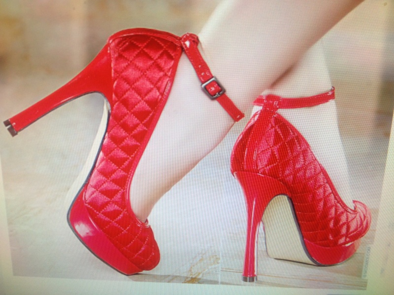 Jte montrerai tout a l'heure je suis au Taff c'est une paire de talon aiguille ouverte avec un noeud devant et tu as deux rubans que tu mets autour de ta cheville elles sont classes mais comme j'ai les pieds fins ça baille.. Je chausse du 38