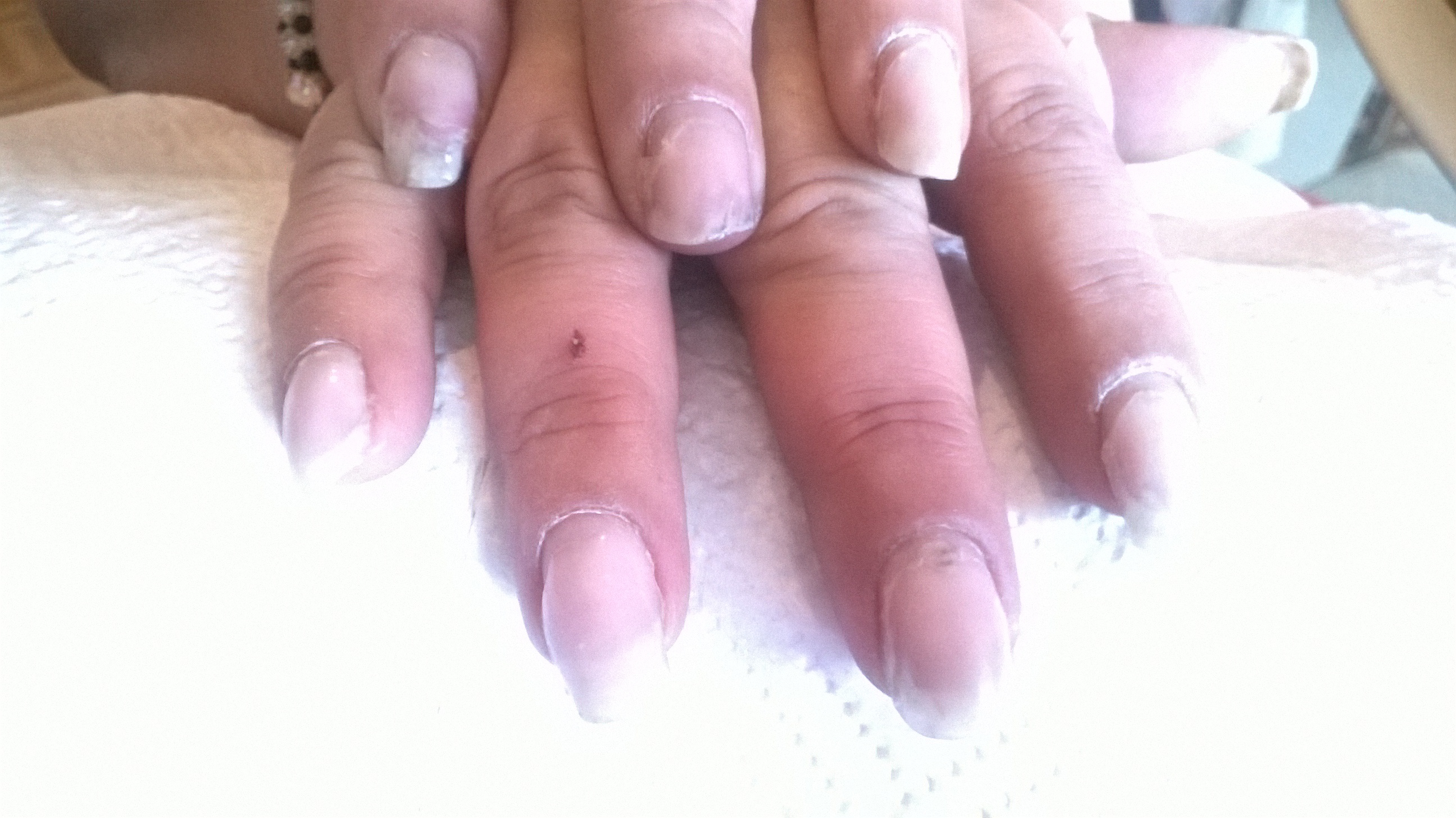 il y a 3 jours une ancienne cliente et amie , m'a appelé à la rescousse, me disant qu elle s'était fait massacré, sachant qu elle ne veut pas de gel je lui propose un gainage avec VP ..... Sauf qu a son arrivée , euh comment dire .... j en ai eu la boule au ventre , les nerfs etc ... Quand je pense que cette nana a un salon , etccc et fait de la grosse merde!!!!