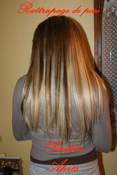 J'ai rattrapé la pose en ajoutant 100mèches. Niveau couleur je n'ai pas pu faire un truc très uniforme et régulier étant donner que je me suis frayer un chemin dans ce qui était déjà là.