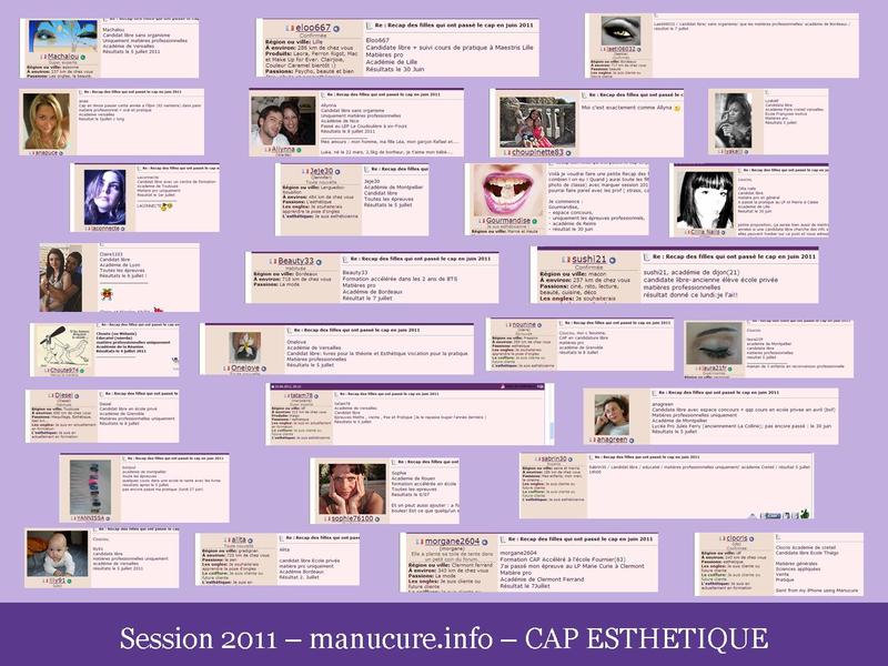Gourmandise Je sus esthéticienne ! 13 Octobre 2011 #41 Re : Recap des filles qui ont passé le cap en juin 2011 Voila !!! un peu en retard mais une récap quand meme !!! Pièces jointes session 2011 cap esthetique manucure. info.jpg 77.1 KB · Affichages: 151