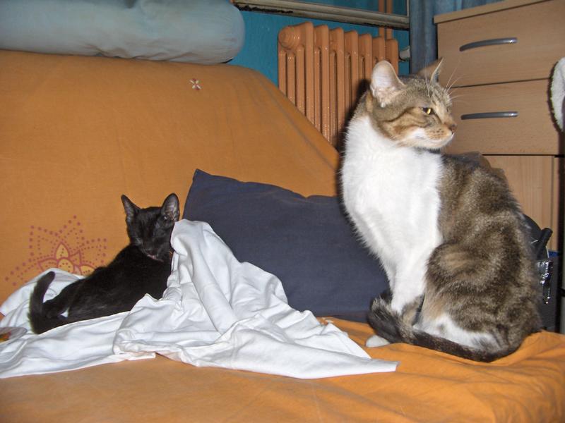 je recherche un petit chaton tout noir, mais vraiment toutoutout noir. il (ou elle) ne sera pas du tout malheureux car 2 copains (une fifille et un malou) l'attendent. je vous met quelques photos de mes namours: Mr Sky (le gros patapouffff) et Mlle Pepsi (la toute fiere).