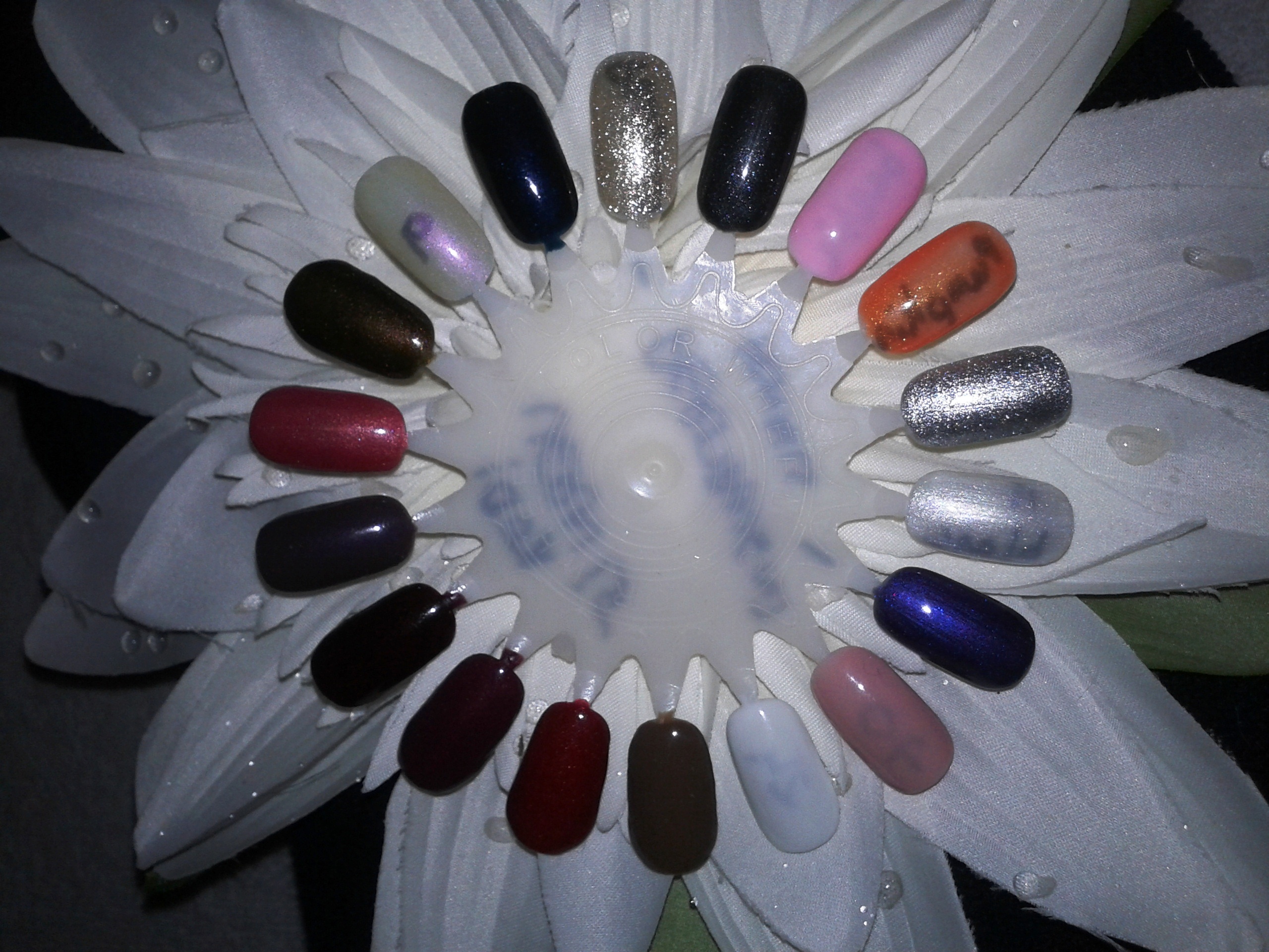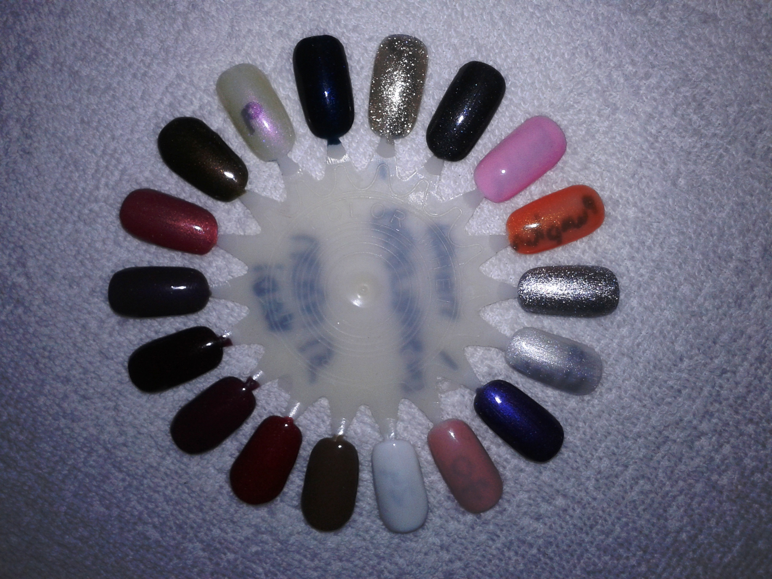 voila le nuancier (en partant de gauche du doré au violet c'est adnails, le reste kodi) mais en vrai ils sont plus beaux la photo ne les mets pas en valeur)
