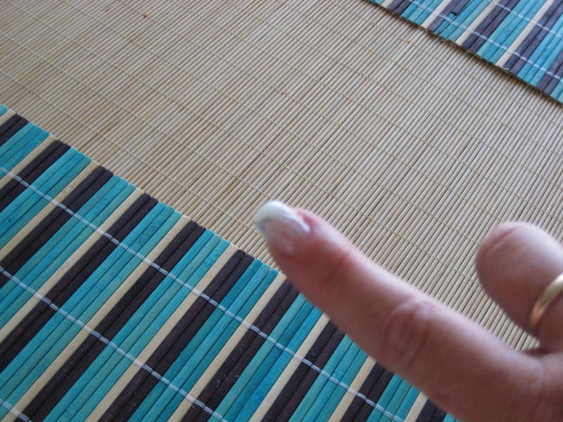 malheureusement on ne voit pas bien sur les photos!!! désolée!!! cela m'arrive quelque fois, en appliquant la french au spot, peut être y avait-il une ptite saleté ou la bulle d'air s'est formé lorsque tu la fais, dans ses cas là je mets un ptit coup de bloc blanc et repasse une seconde couche de french
