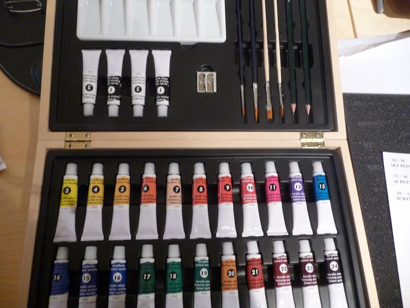 Hier une fille à parlé de peinture acrylique de chez liddel je suis allée mais c'est seulement lundi alors la fille du liddel ma fait cette malette d'une promo de il y a 2 semaines à 12 euros. Pas mal non il y a pinceaux et 26 couleurs