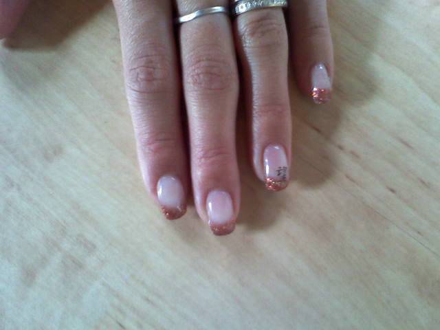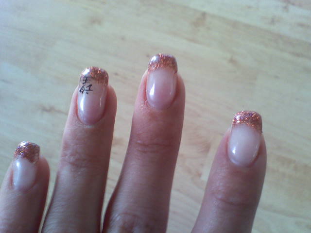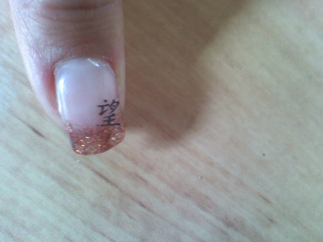 coucou voilà une couleur que j'ai voulue essayé et je la trouve très jolie c'est donc un abricot pailleté avec un sigle chinois qu'en pensez vous allez y n'ayez pas peur hi hi