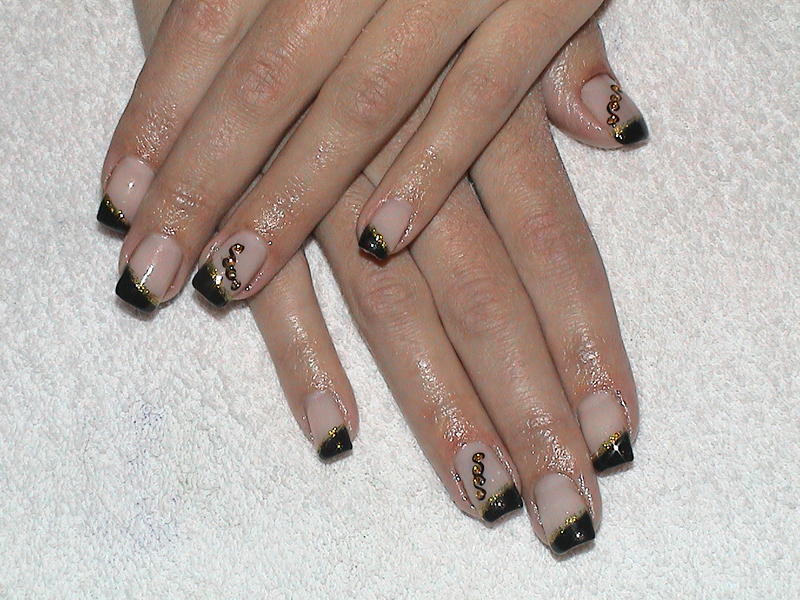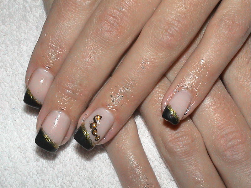 merci, c'est au gel noir, elle voulait une french noir, elle aimait mes poses en biais et surligné de paillette alors ça a donné ça, elle m'a même laissé lui faire un petit dessin sur l'annulaire et le pouce, je me suis éclatée!!!!