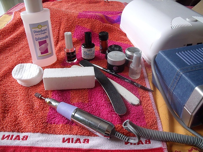 Débutons l'analyse : Les ongles semblent sains, il n'y a pas de lésions ni de tâches suspectes. Il y a une repousse de 3 semaines bien nette. La pose est plutôt fine (nous pourrions donc aisément nous dispenser de la ponceuse, mais je l'utiliserai pour montrer comment faire). La cliente veut garder la longueur actuelle (Les caprices de belle maman ^^) On voit le bord libre, il faudra donc utiliser un couvrant si l'on garde cette longueur. Les parallèles auront besoin d'être rectifiées ainsi que la forme. Maintenant nous savons quel protocole employer et quels produits utiliser, nous débutons le remplissage.