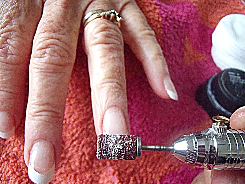 Vu qu'il ne faut retirer que ce qui est nécessaire, on va juste passer un coup de ponceuse sur le bout de la pose (là ou se trouve la frenc) pour affiner l'extrémité et creuser un sillon dans lequel nous referons une french. Gardez le plus de gel possible !!!