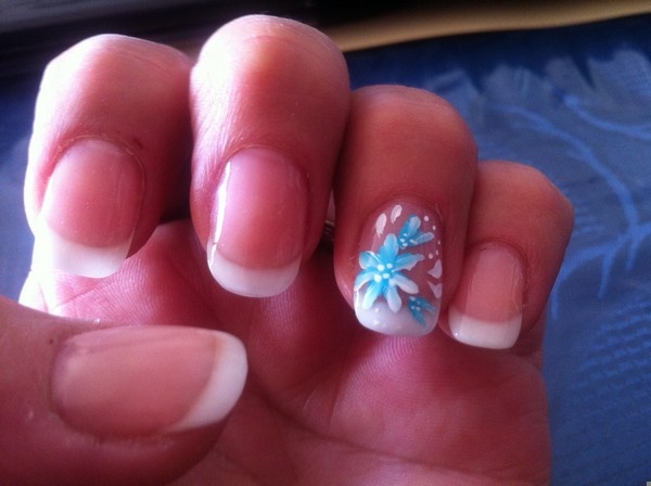 bah voilà, remplissage fait avec rallongement chablons, gel cover pêche, french blanc nature, et ptite déco peinture, une seule main,l'autre prend la photo, lol