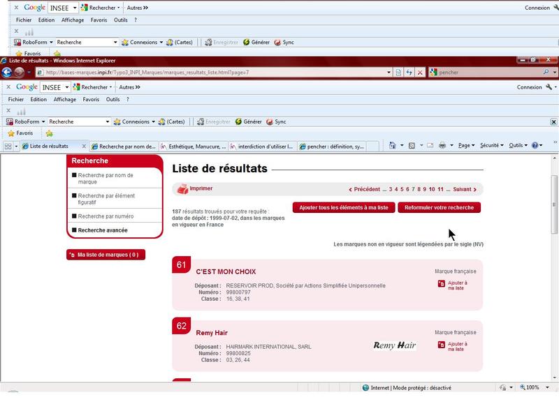 c'est la page de l'INPI qui répertorie les marques déposées exactement le 1999-07-02. On peut y voir clairement, qu'effectivement les mails de menace de poursuite pour l'utilisation du terme "Remy Hair" utilisé pour désigner la qualité ou le processus de fabrication, SEMBLENT ETRE JUSTIFIES !!!Alors maintenant on fait quoi ? Si je comprends bien on doit vraiement cesser d'utiliser ce terme !