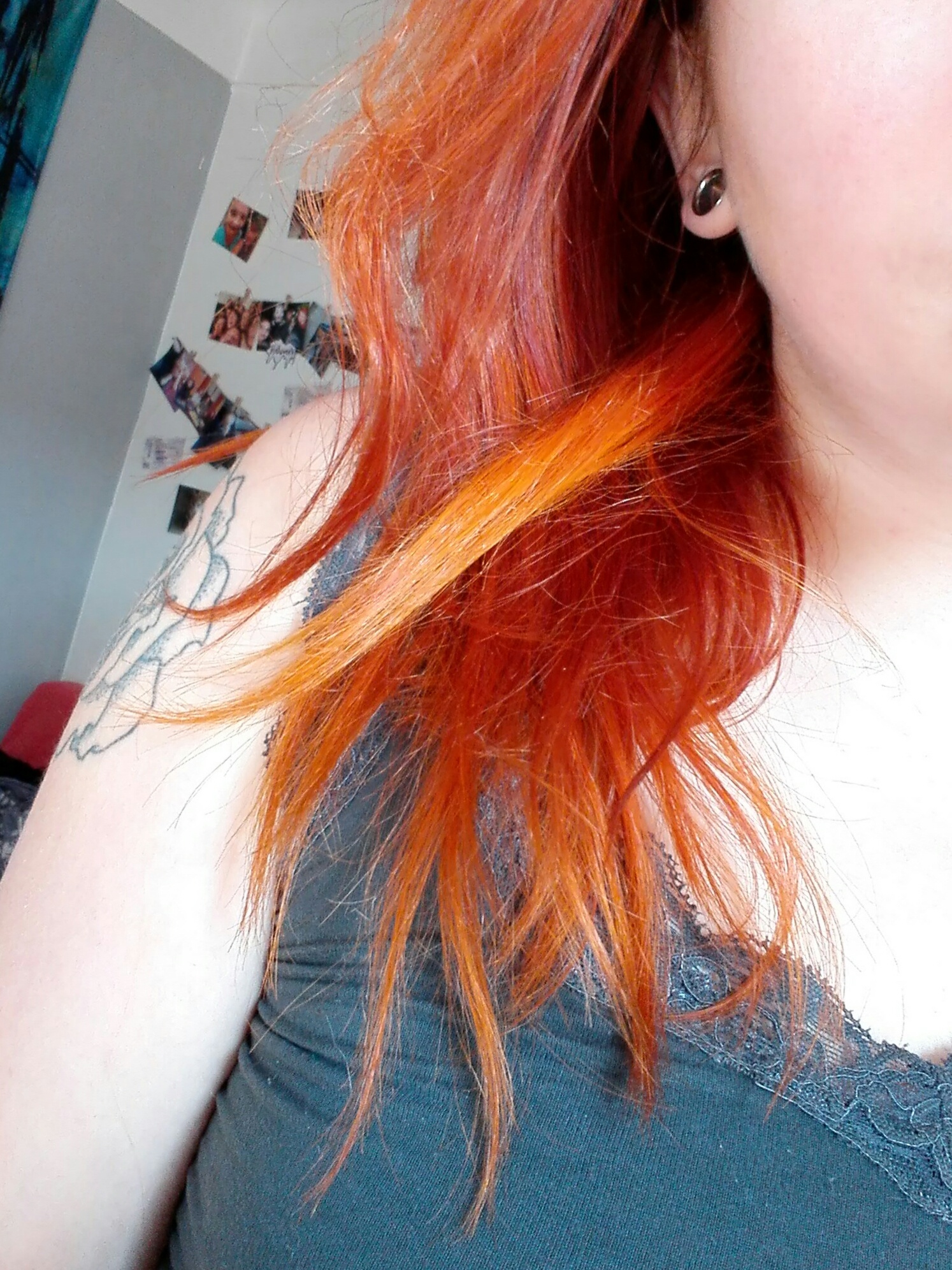 Je vous mets une photo de ma couleur actuelle ainsi qu'une photo avec une mèche test où j'avais fait 2 décolorations.