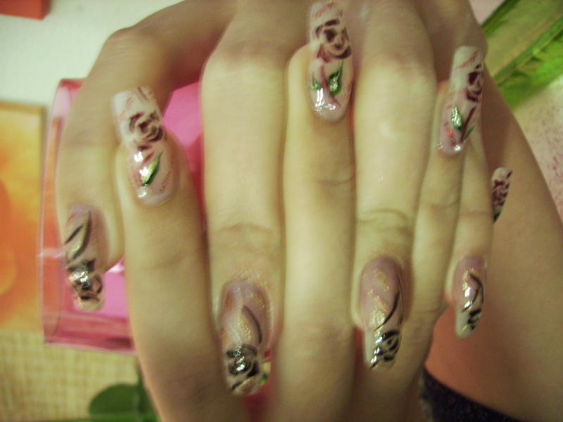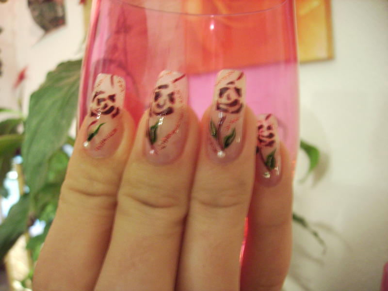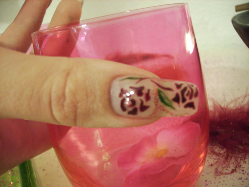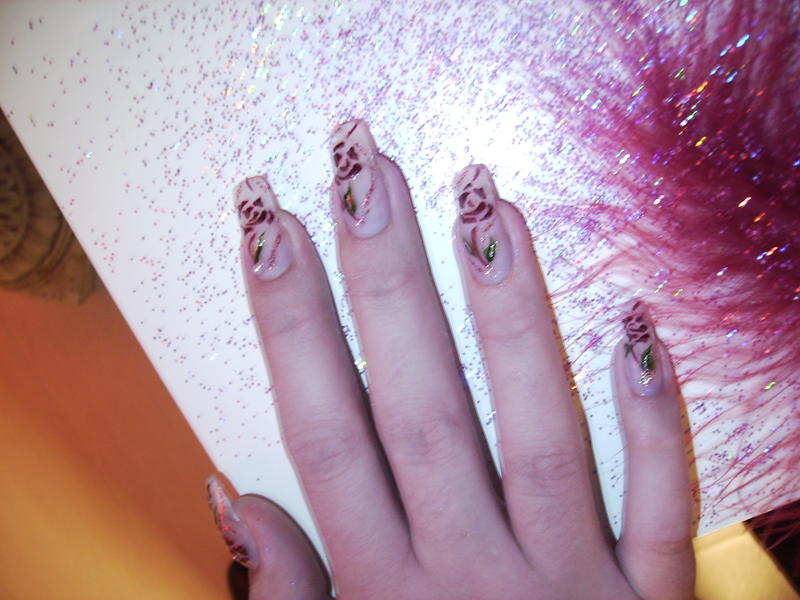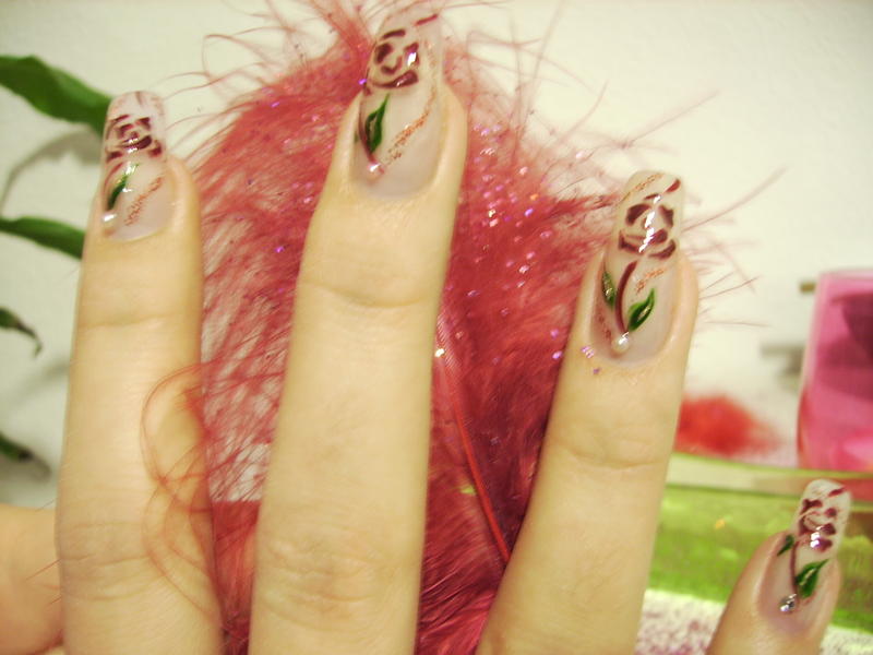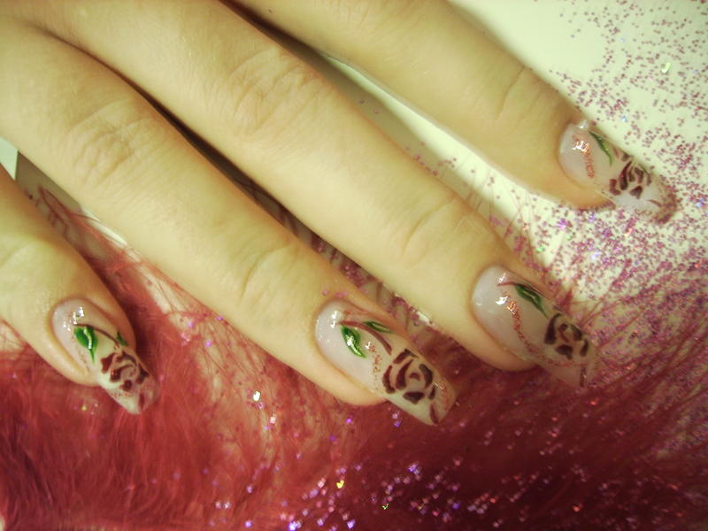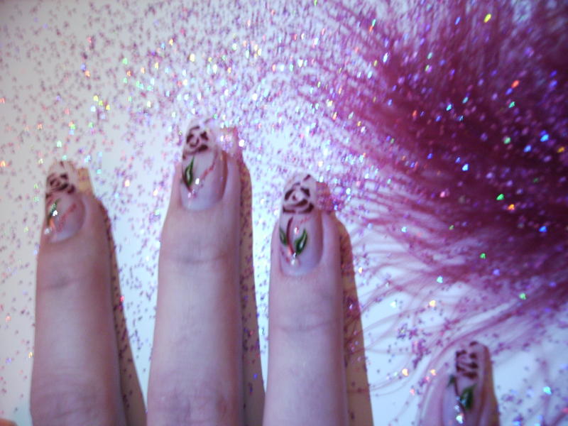 Main droite roses rouges ( au vernis ), pailettes rouges et feuilles vertes