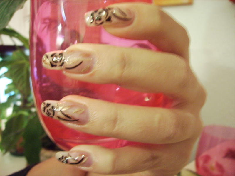 Main gauche roses chocolat pailleté, decos aux vernis cuivré, beige scintillant et or + strass