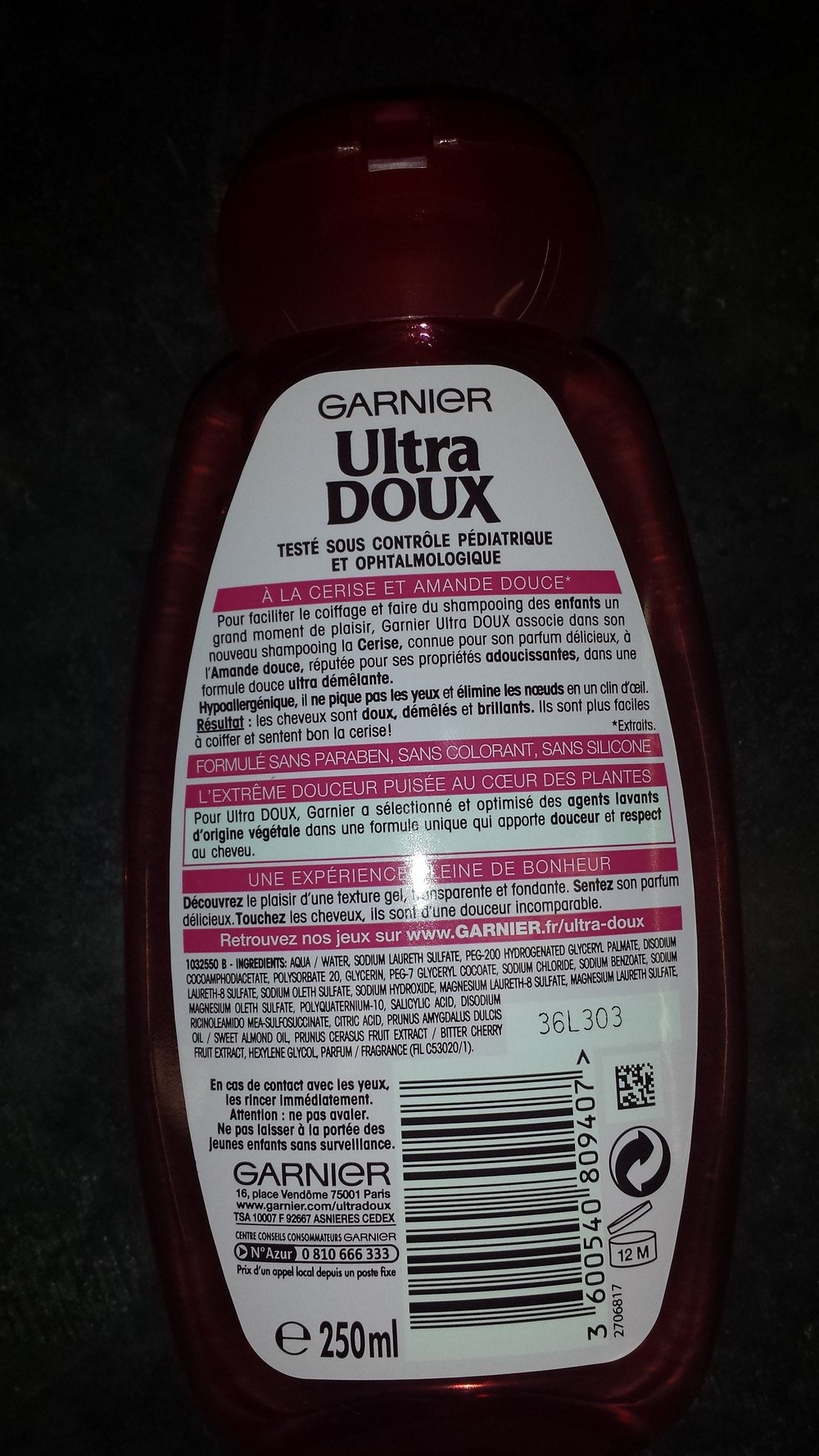 Ultra doux shampooing 2 en 1, aux extraits de cerise et d'amande douce.