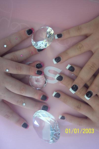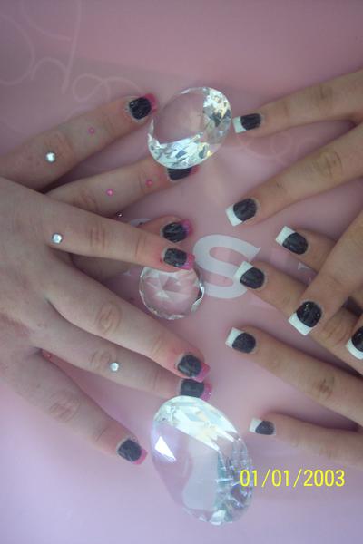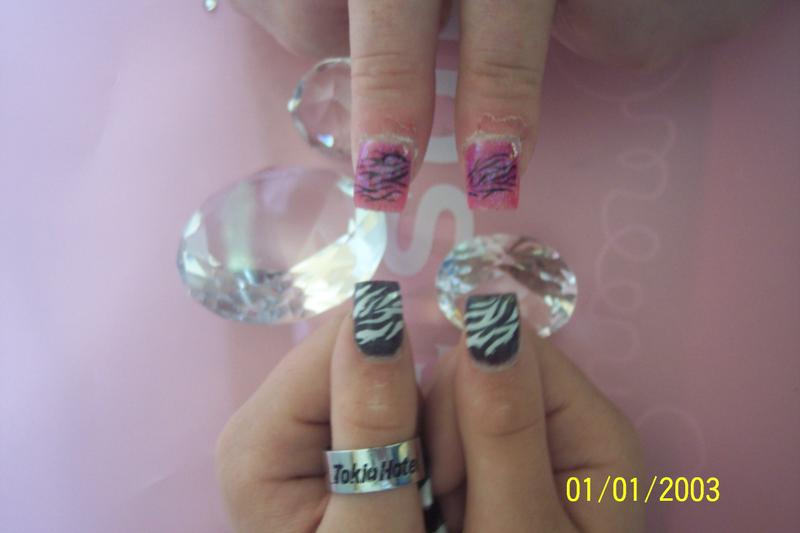 Revoila mes petites fan de tokio hotel... on reste dans le style pour la première avec la pose de bill kaulitz avec juste le poiuce qui change, donc base noir avec motif zébré fait main avec mon gel french, la deuxième base noir french pailletée rose glossy, et meme pouce adaptée... ben voila un moment de régal pour moi meme si c'est pas trop mon style mais qd y a de la couleur c'est tjrs mon truc... voila la scéance photo !