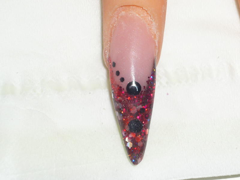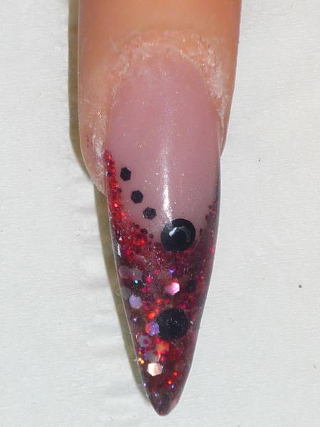 c'est de la résine rouge pailletée que j'ai alterné avec du noir (oups j'ai pas mis la photo du dessous de l'ongle car j'ai fait un effet pour le fun !!!) je la mettrai plus tard... j'ai ensuite rajouté des paillettes rouge plus foncé, des confettis noir et argent....