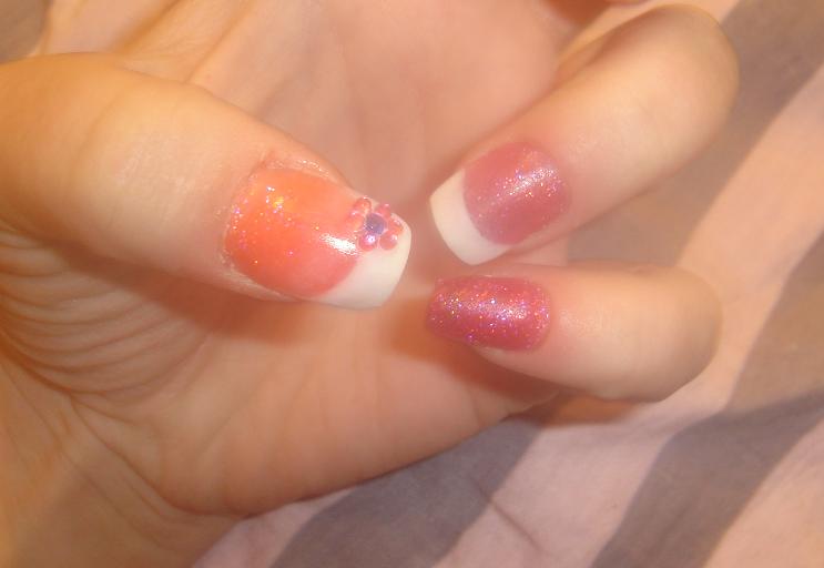 Donc le pouce résine corail pailleté et french avec une tite déco en strass, le petit doigt pose simple rose pailleté, l'annulaire pose rose avec french...