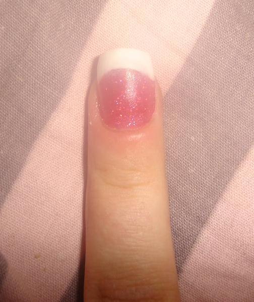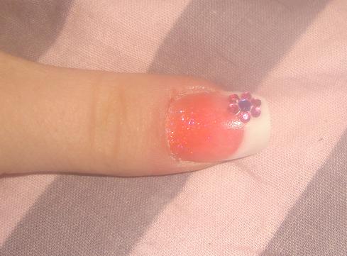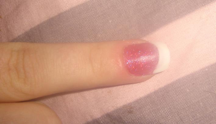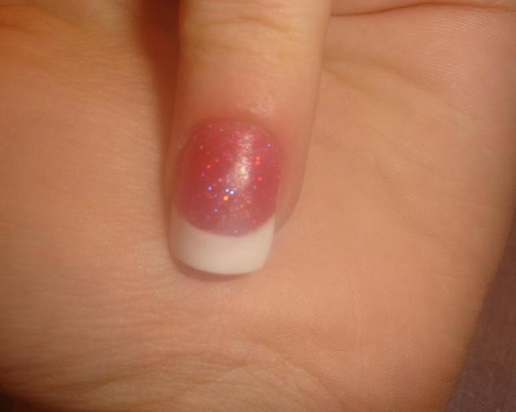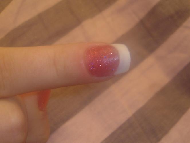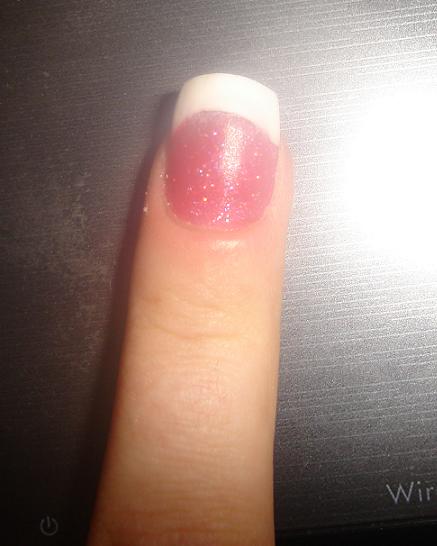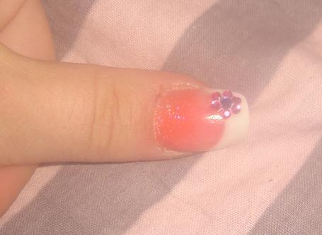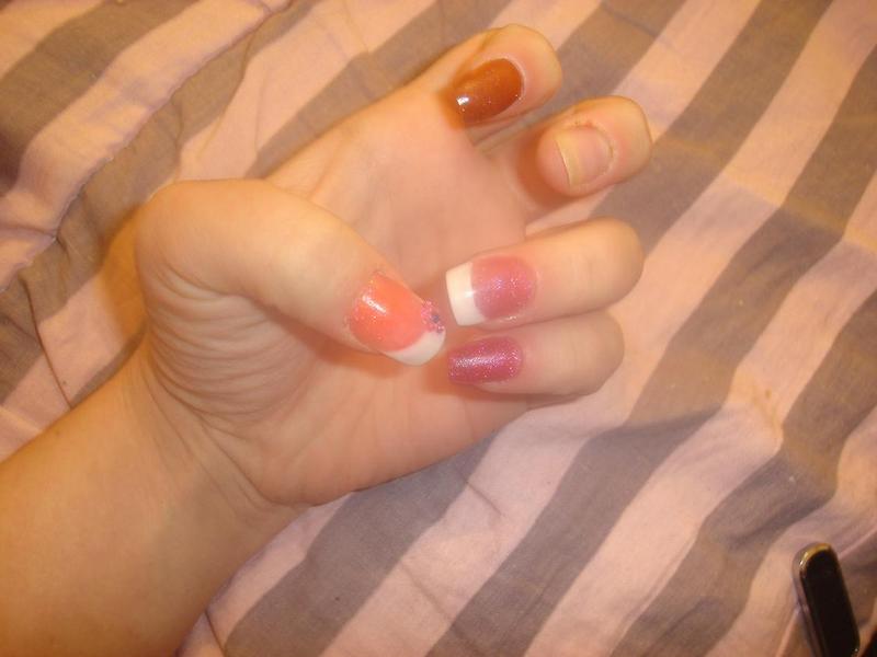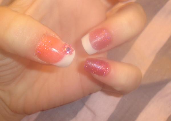, enfin sauf pour le majeur :8-confused:Donc le pouce résine corail pailleté et french avec une tite déco en strass, le petit doigt pose simple rose pailleté, l'annulaire pose rose avec french...