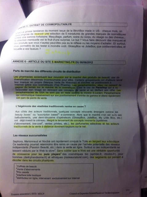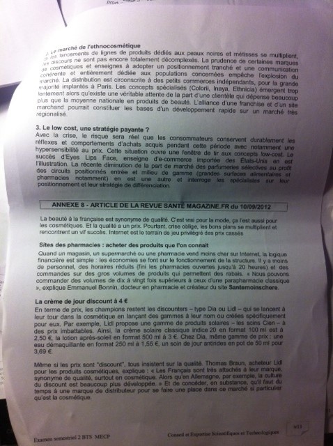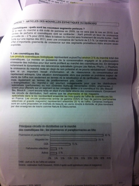 Bonjour Carodebordo,Bonjour. Ca va être d'autant plus difficile qu'il s'agit d'un nouveau BTS : Métiers de l'Esthétique, Cosmétique, Parfumerie. Nos profs ne savent pas à quoi s'attendre, on a très peu d'informations, je lis en long en large et en travers le nouveau référentiel. De ce qu'on nous dit, et ce que nous avons eu en BTS blanc, il va y avoir beaucoup d'études de cas.