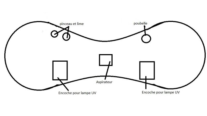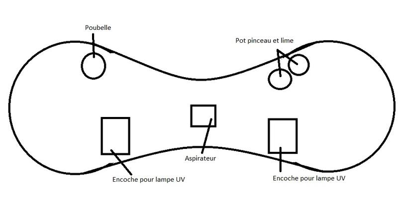 Donc je pars sur une base de table cacahuete avec un trou pour ranger mes limes un autre pour les pinceaux un autre pour ma poubelle de table ... et sur un des coter de mon pied qui serra pleins des étageres ^^ voilà dite moi ce que vous pensez de mon idée !