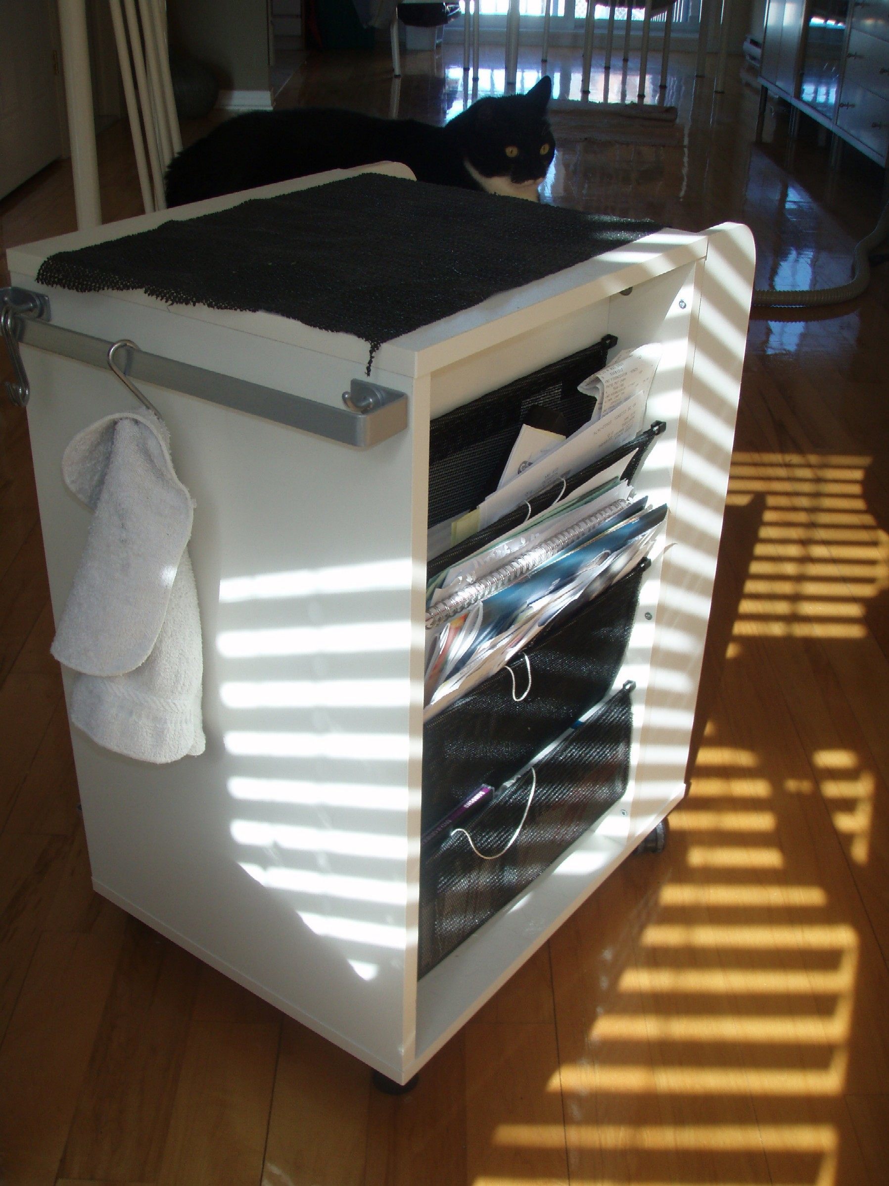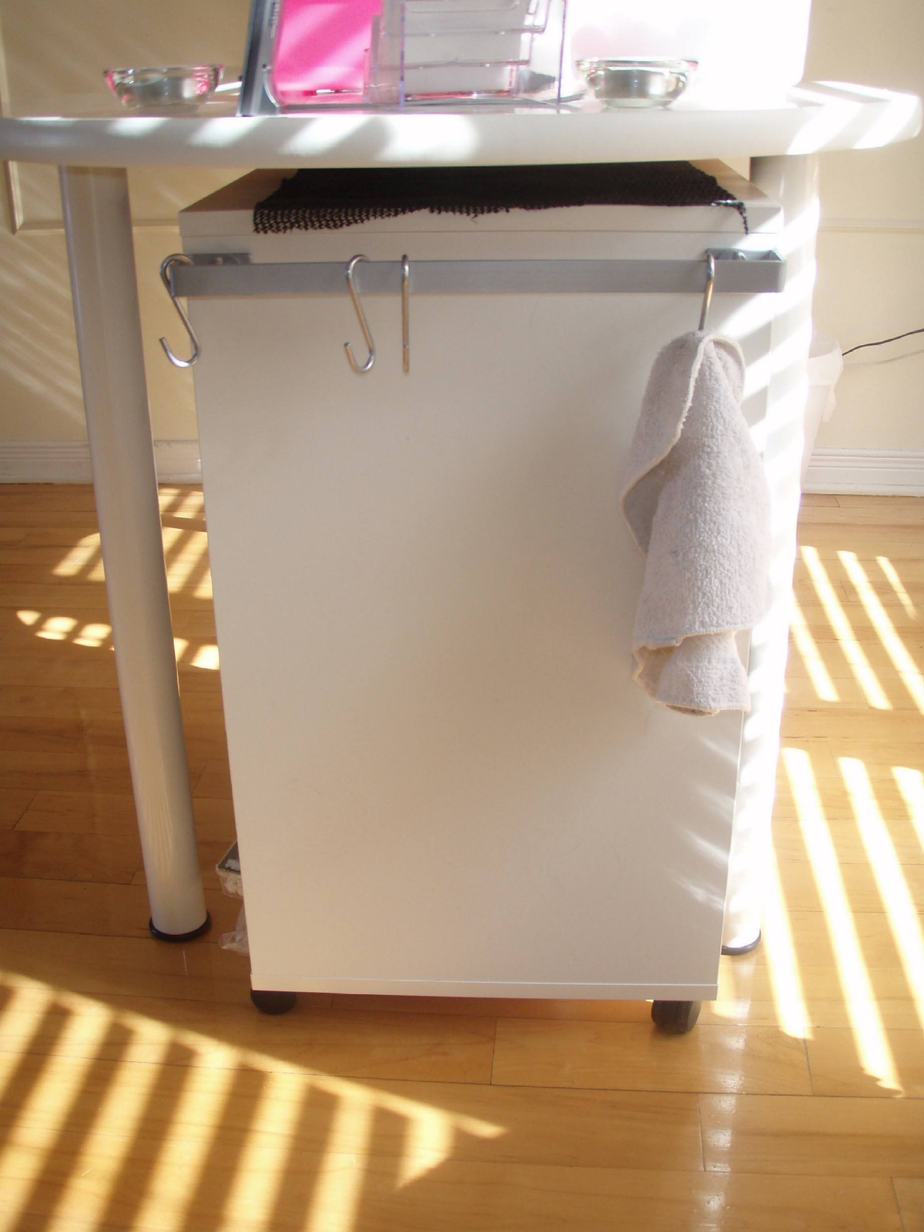 Je suis à la recherche de ma table. J'aime bien la cacahuete rouge chez Ikea. Mais j'ai trouvé un autre meuble de rangement. Il fait 69cm de haut, et la table cachuete avec les pieds 70cm de haut, donc je vais pouvoir le mettre sous la table.