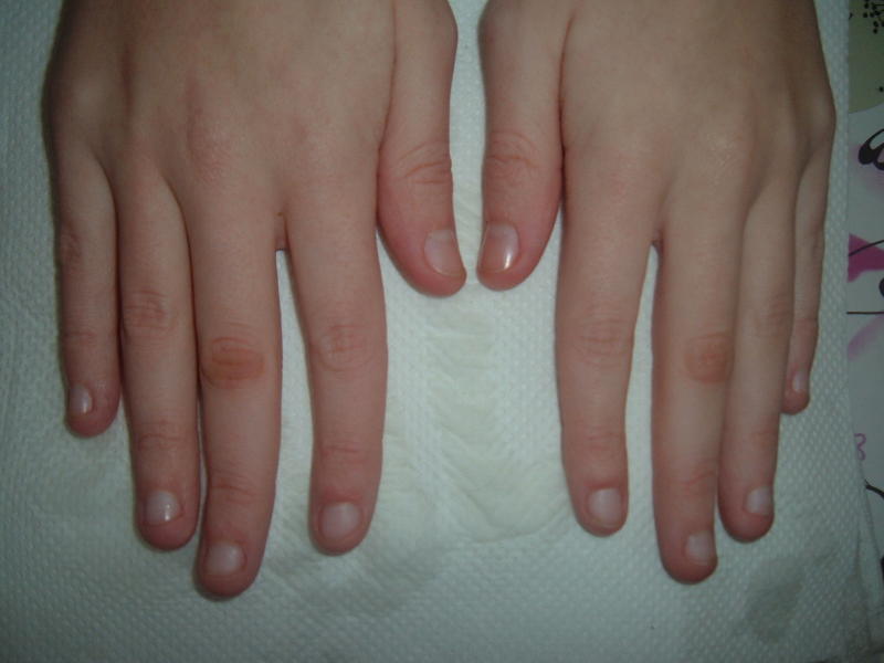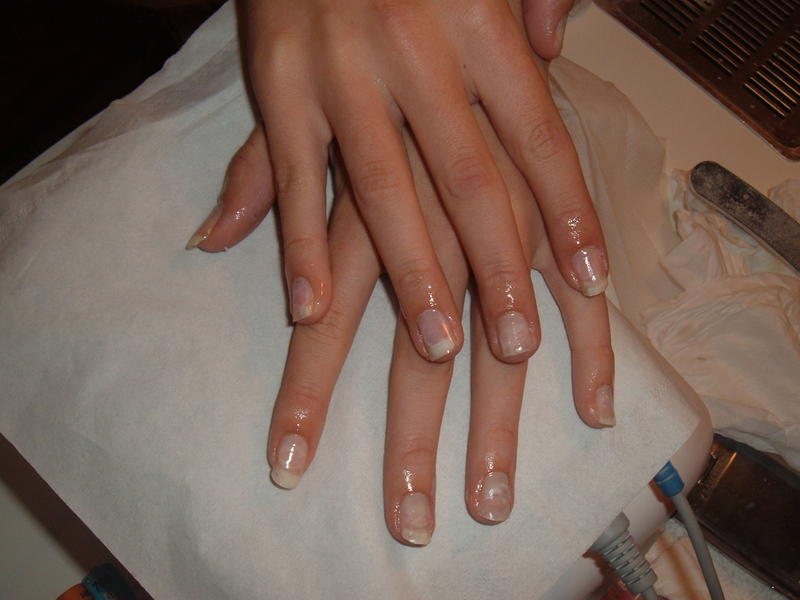 2, à certains doigts on voi qu'il était grand temps qu'elle vienne car, ca commencait à se décoller doucement, donc elle s'est peut être accrochée et ca peu causer des tites blessures aux ongles.