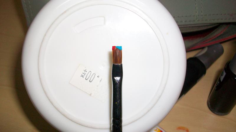 en 1er sur un seul cote du pinceau, prenez une seule couleur, il faut mettre la peinture sur le bord du poil, inutile den mettre sur la base/la profondeur du poil, sur une feuille faite un trait en forme de "u" a l'enver ( un arc en ciel koi)