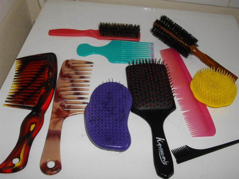 -ustensiles de coiffage( brosses rondes, plates, carrés, la grosse carré je ne l'utilise plus, car cheveux courts,Tangle Teezer des ricaines, peigne afro, peignes à grandes dents, petits dents, plate, pour tracer, le devant est cassé lol, le grand marron clair je ne l'utilise plus aussi,)