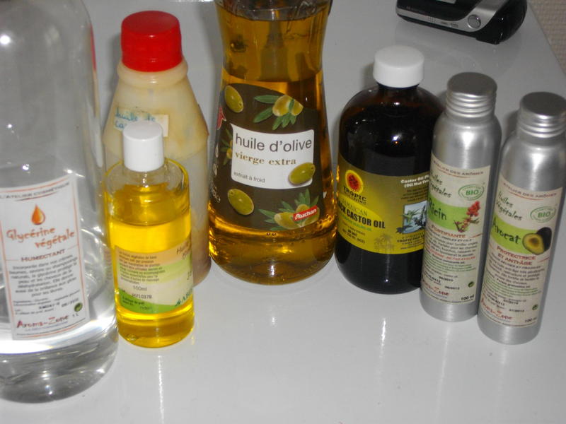 -huiles nourrissantes ( jojoba, avocat, olive, et 3 sortes de ricins( carapate du bled, jbco américain, ricin français