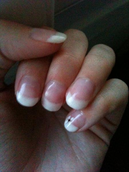 pas mal pour une premiére fois!!! mais oui faut revoir le limage des bosse et respecter t cuticules! ( laisser toujour un petit mm entre la resine et les cuticules) sinon tu risque d'avoir des bulle d'air au moment ou les ongles naturel vont poussé mais a part sa chapeau!! tu te debrouille deja trés bien!!
