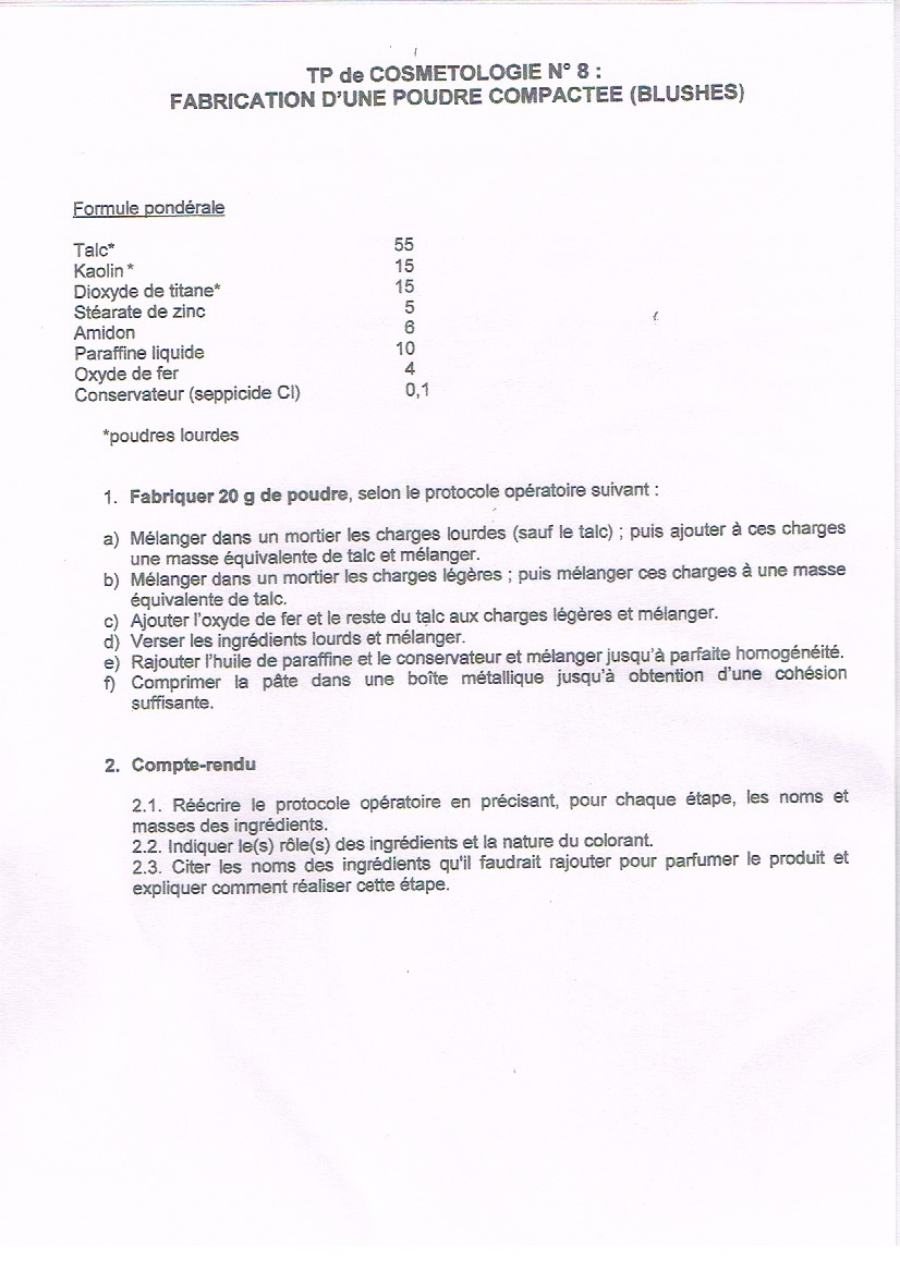 a super car j'ai récupérer des cour de tp de l'académie de grenoble et il y avait nombreuse poudre, stick a lèvres et autres produits compliqué!