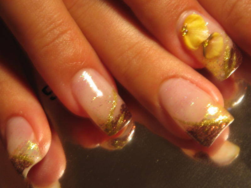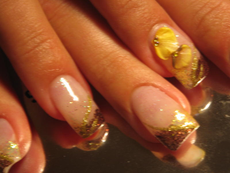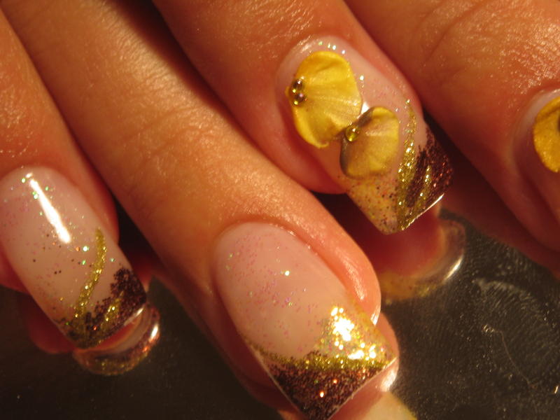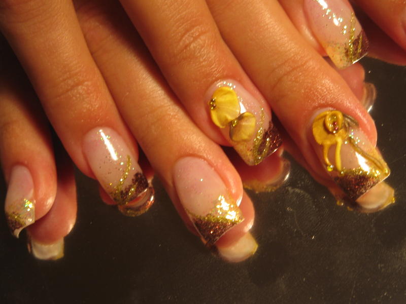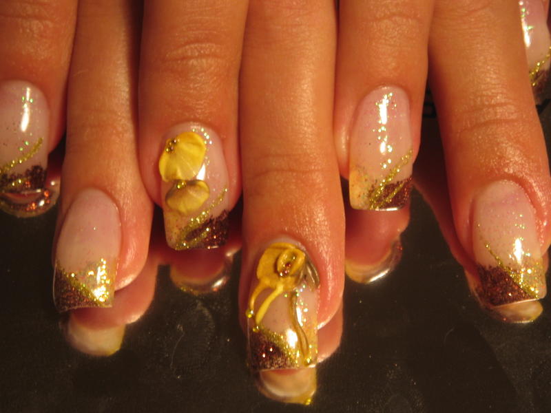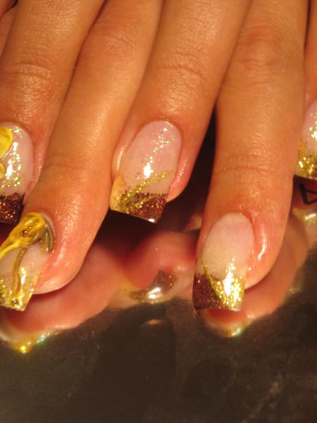*et pour la deuxième: fond paillettes crystal, french paillettes marron et jaune, décos liner or et touche finale 3D (dont un complètement foiré!!!) avec tits strass...pour les gels rallongement au make up et construction aufbau, seeling et finition gloss césars