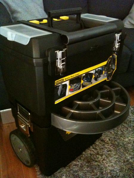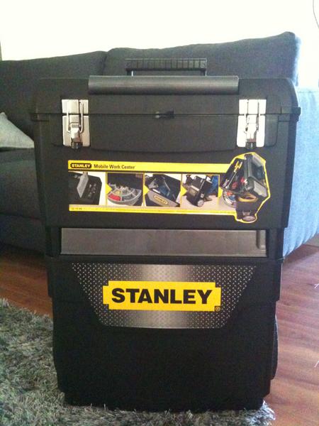 Voilà après plus de 4 ans j'ai enfin investi dans un trolley. J'ai succombé à vos photos et complètement par hasard en allant chez Casto hier soir, j'ai trouvé un trolley Stanley en promo à 29 euros et des brouettes !!! Je suis aux anges. Il ne me reste plus qu'à le customiser, mais par chance il est gris et noir, sauf les clips jaune.........:confused: