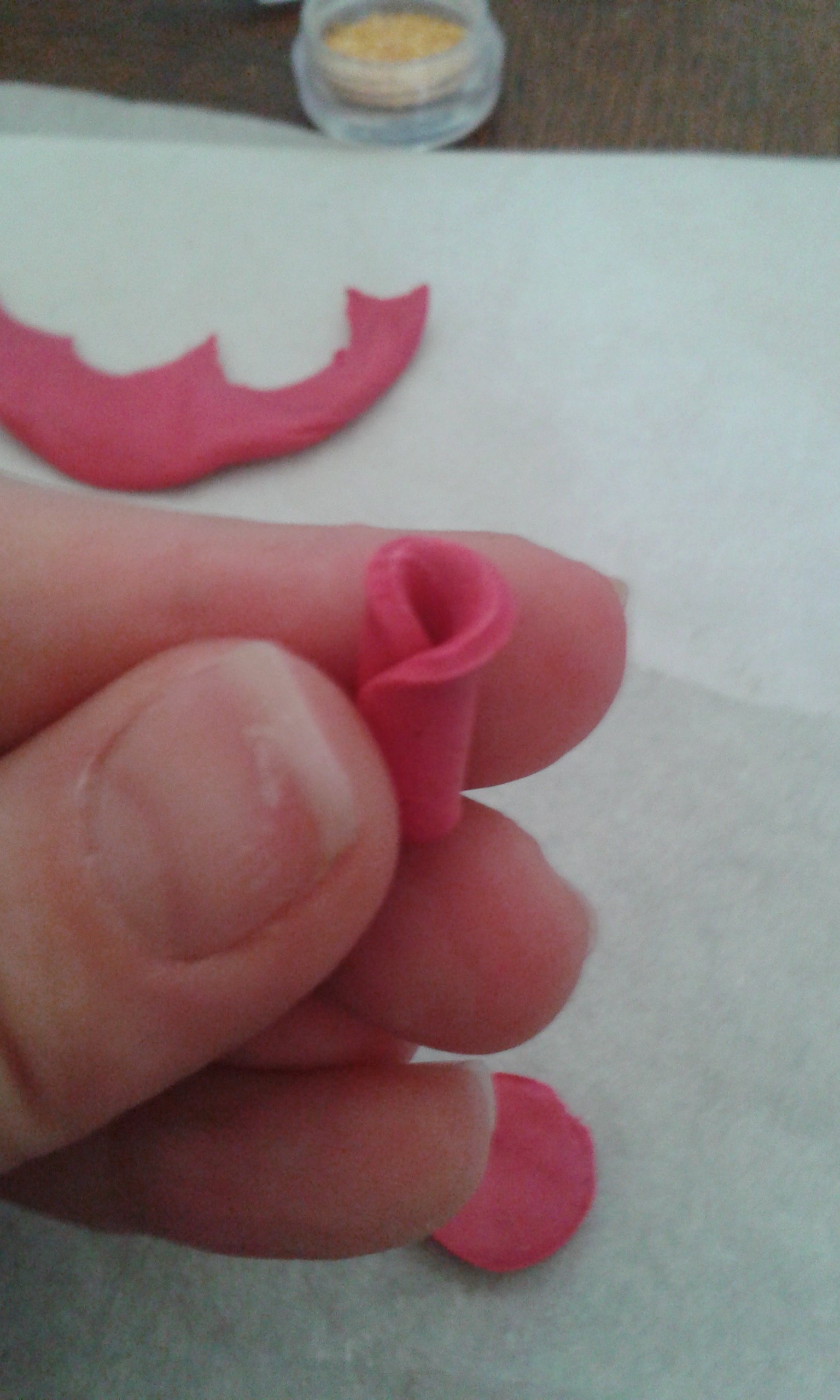 - Ensuite on reforme d'autres boules et idem on aplaties pour nos petits pétales qui viennent entourés notre coeur de rose...Pas plus de 3/4 vu que l'in va en faire une petite...et pour fignoler on travail les contours pour l'effet fleurs!!