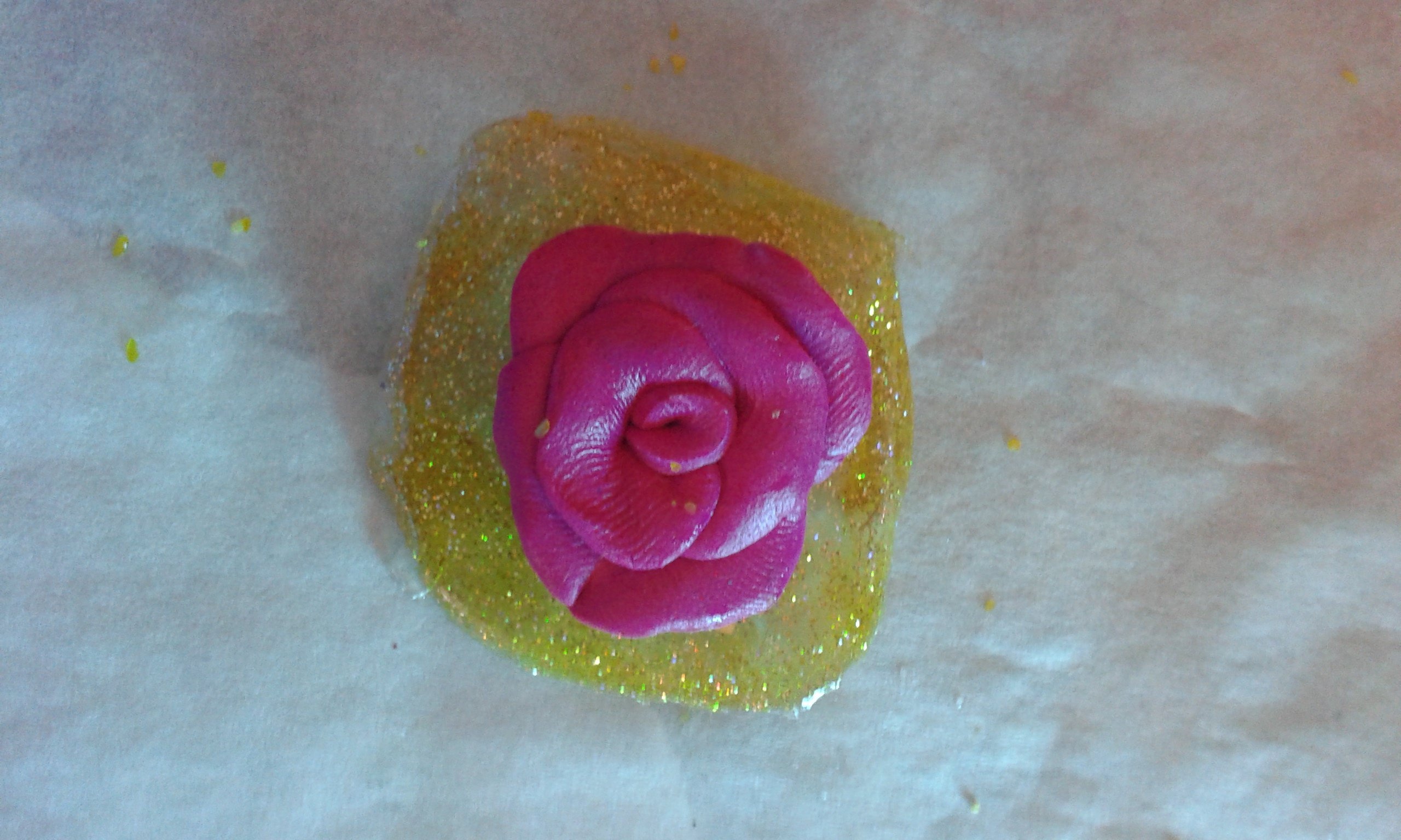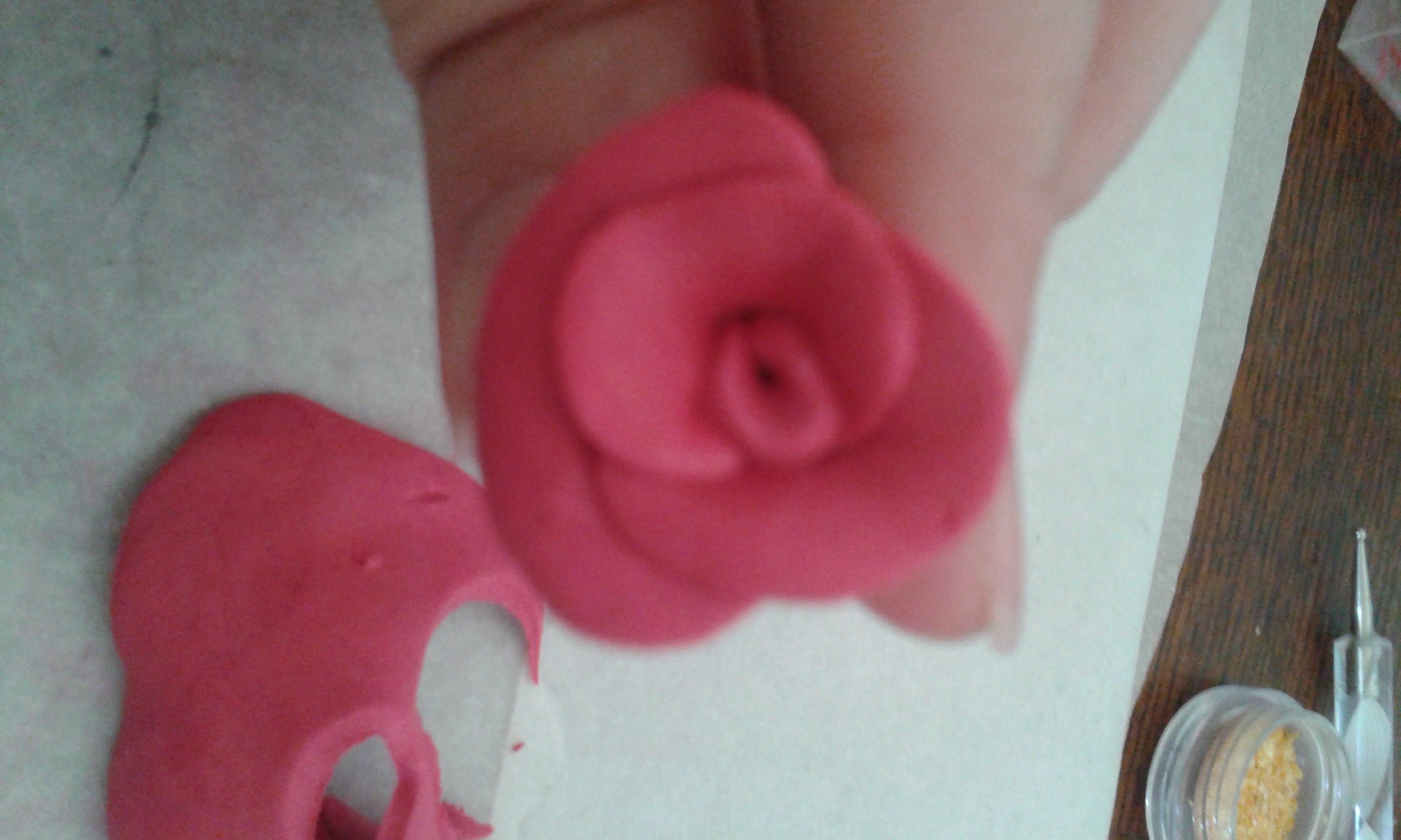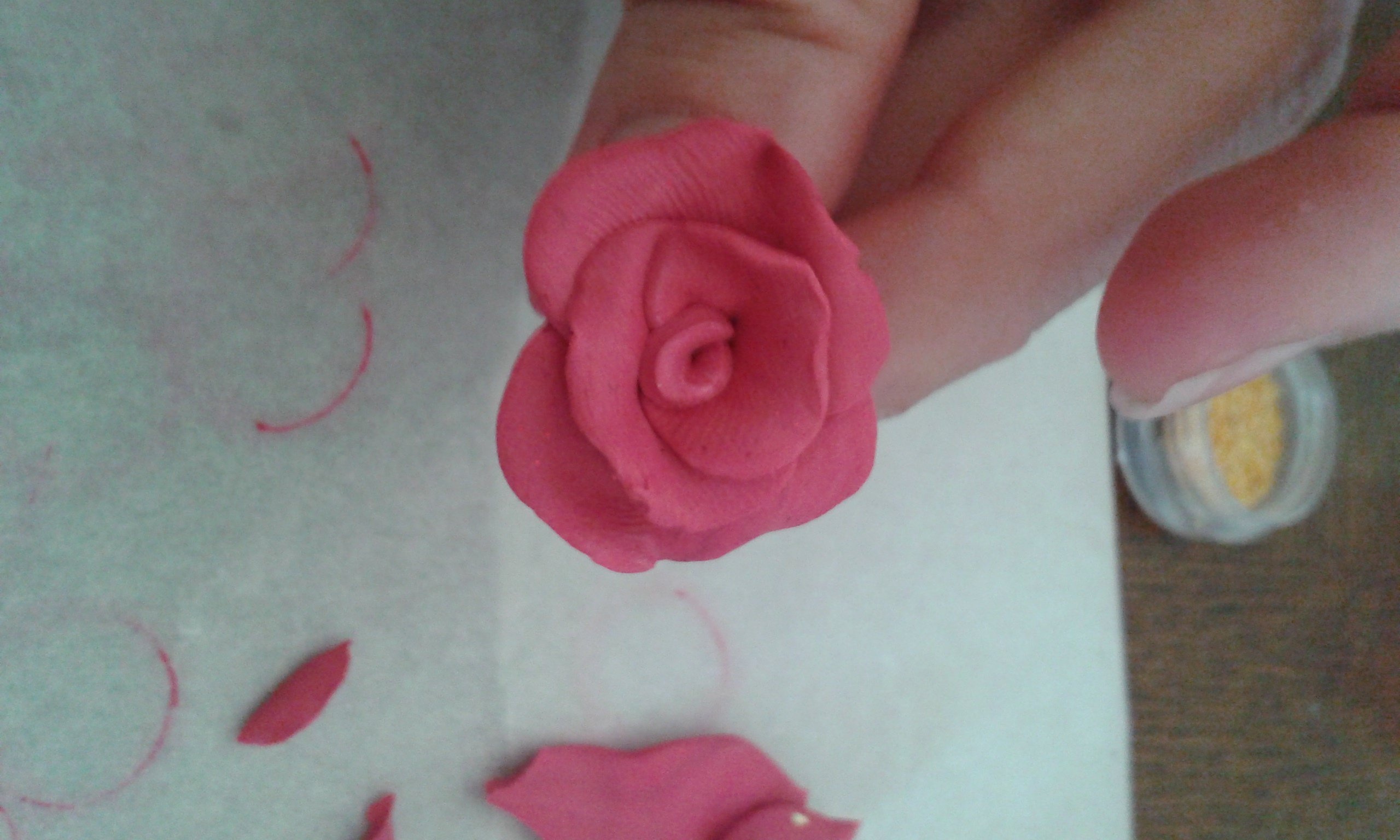 - la rose fimo: on prend une boule de pâte que l'on aplatie avec ces petits doigts et ensuite on l'enroule sur le petit bout sur lui-même pour faire le cœur de notre rose!!