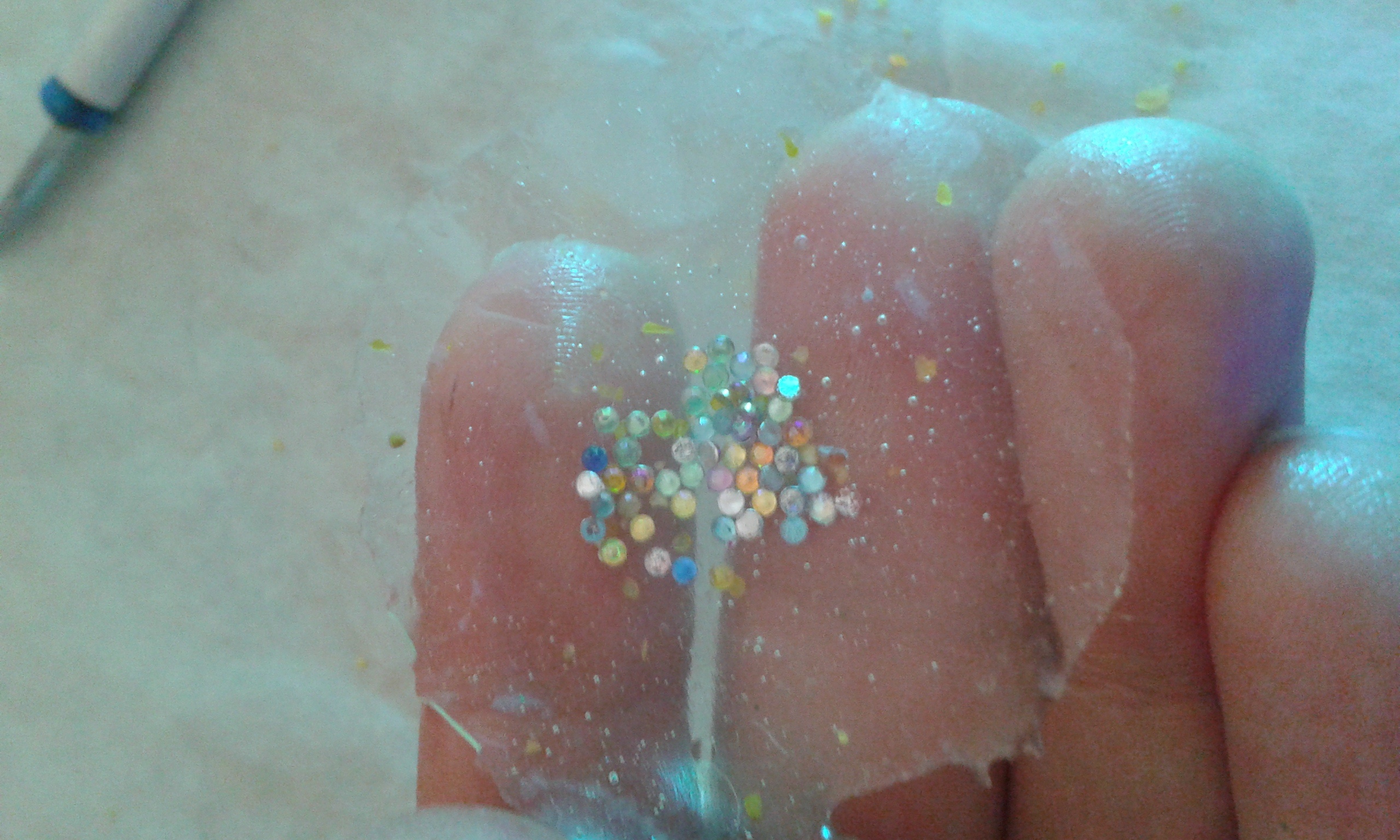 - Prenez votre couvercle mettez-y vos décos et un peu d'eau!!Donc ici strass,paillettes et ma rose en fimo^^