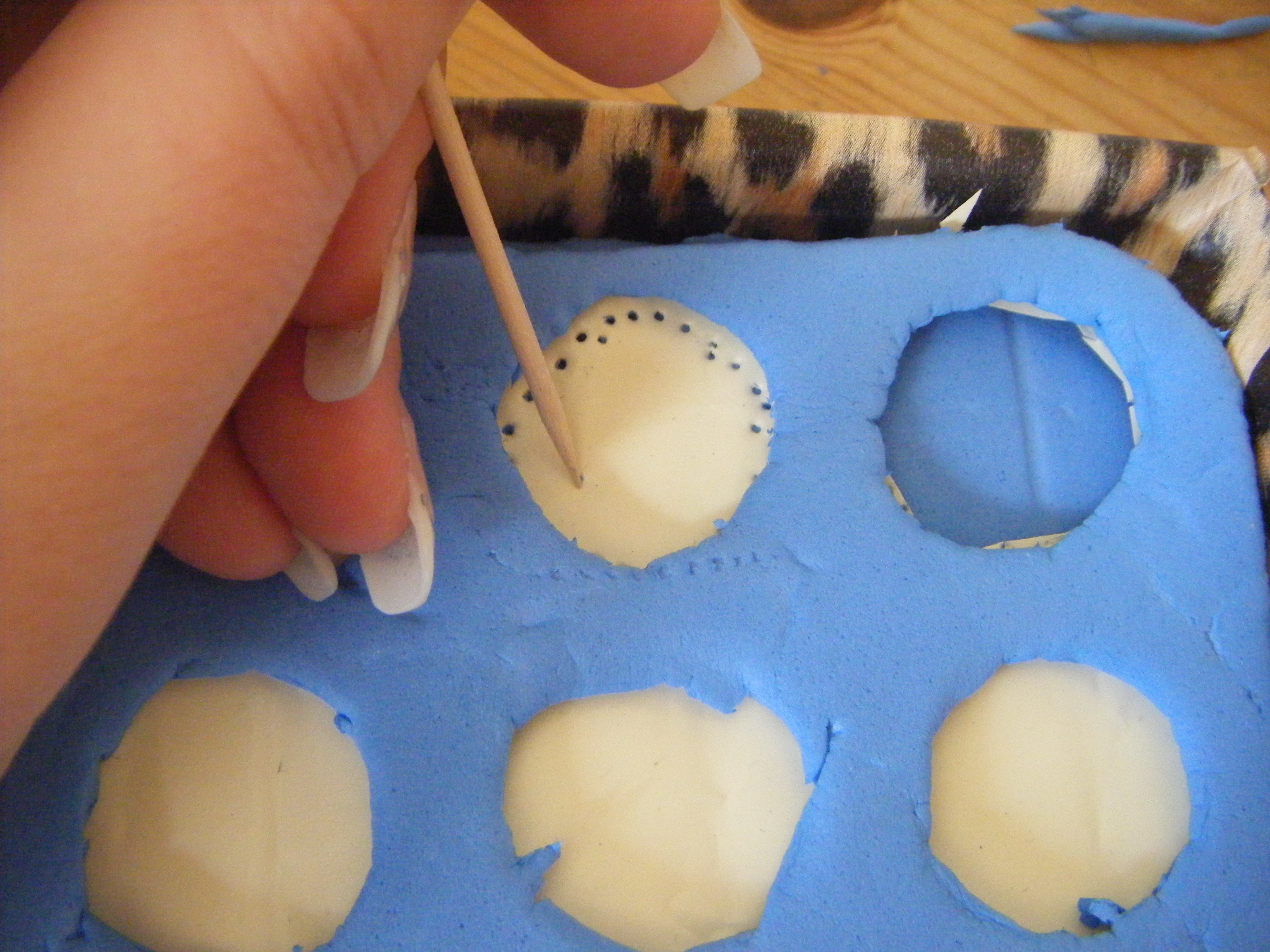 Ensuite j'ai découpé les ronds. J'ai recouvert la mousse de papier collant et à l'aide d'un cure-dents j'ai tracé le contour des cercles afin de pouvoir les découper. Et j'ai rangé mes petites boites rondes.