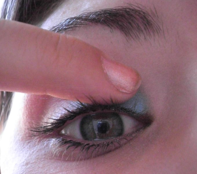 j'applique le bleu turquoise grossièrement juste sur le coin interne de l'oeil jusqu'au milieu (avec mes doigts car je ne travaille qu'avec, a vous de faire selon vos habitudes. )