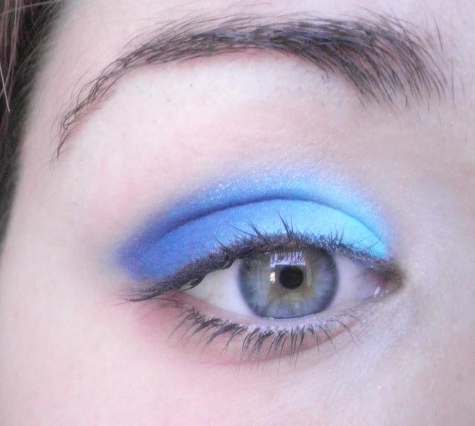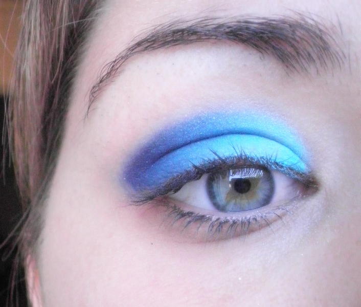 ) sur le milieu en essayant de ne pas faire de démarcation, et ensuite j'ai appliquer le blanc au niveau des sourcils ( a ras) pour donner de la lumière. et la par exemple j'ai intensifier le dessous (ras des cils) avec du bleu un peu plus profond