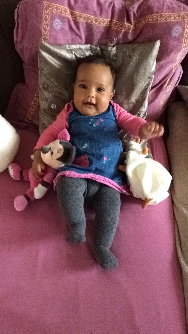 Ici Laureen a 4mois et 2semaines environ elle mange des petit pots midi et au gouter, elle se retourne du ventre au dos =) elle est adorable mais tjr aussi demandeuse de sa maman lol. Tjr allaitement au sein, cododo et coller a moi. Elle dors un peu mieux mais jamais sans moi !! Je vous met une petite photo de ma princesse ^^Afficher la pièce jointe 716214